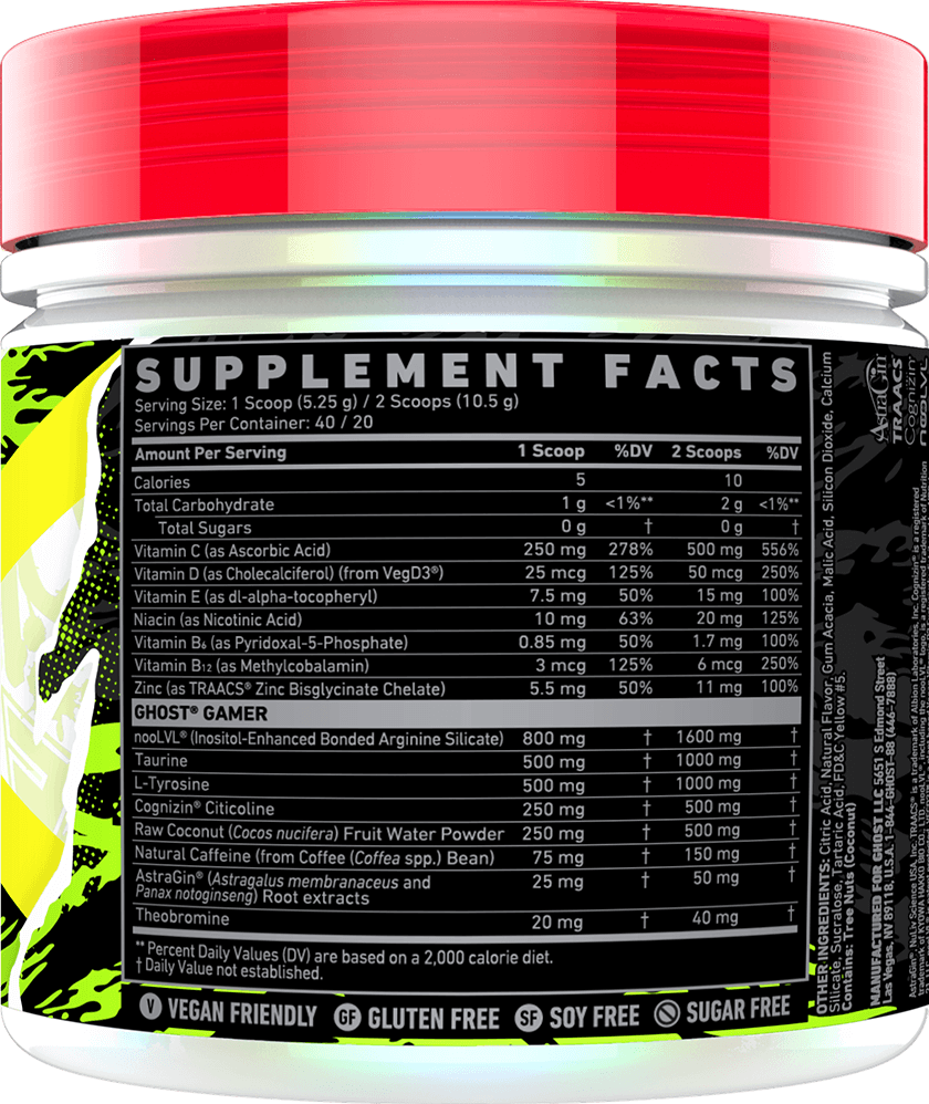 Nosta energiatasoasi ja keskittymiskykyäsi Ghost Gamerin avulla – se on nootrooppisten aineiden ja luonnollisen energian yhdistelmä, joka on valmistettu aitoon Ghost-tyyliin. Jokainen annos sisältää tehokkaan Ghost Gamer -sekoituksen, jossa on nooLVL®:ää, L-tyrosiinia, raakaa kookosta ja luonnollista kofeiinia.