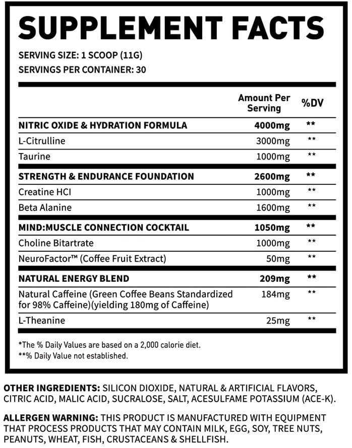 Jokainen annos sisältää 3 g L-sitrulliinia, 1 g tauriinia, 1 g kreatiinihydrokloridia ja 1,6 g beeta-alaniinia. Lisätty luonnollinen kofeiini tarjoaa tasaista, hermostuneisuutta vähentävää energiaa ja keskittymiskykyä – täydellinen sekä aloittelijoille että kokeneille urheilijoille.