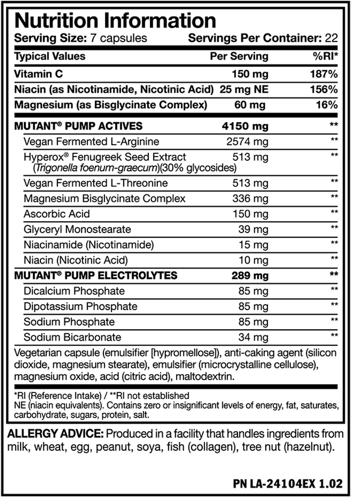 Mutant Pump on valmistettu huolella valituista ainesosista oikeina annoksina maksimaalisen tehon saavuttamiseksi. Se sisältää yli 4 g vaikuttavia aineita annosta kohden, mukaan lukien (vegaanisesti fermentoitu) L-arginiinia, Hyperox®-sarviapilansiemenuutetta, (vegaanisesti fermentoitua) L-treoniinia ja magnesiumia.