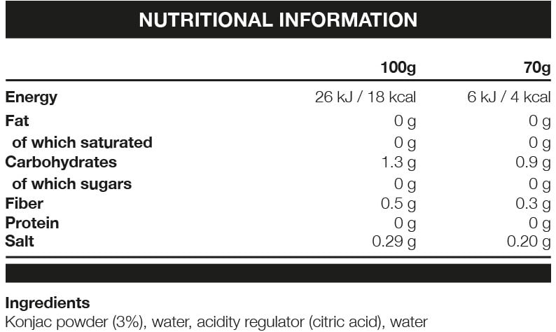 Kiinteän koostumuksensa ja neutraalin makunsa ansiosta tämä pasta sopii erinomaisesti pohjaksi kaikenlaisille kastikkeille ja proteiineille. Älykäs valinta kalorirajoitettuihin ruokavalioihin – nopeaa, helppoa ja täyttävää!